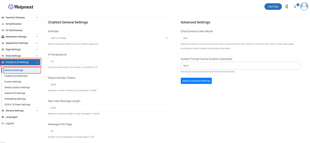 This page lets the admin configure key general settings for the Chatbot and AI system. Here, you can manage options like the default AI model, temperature level, system prompt caching, and whether clients are allowed to use their own API keys.