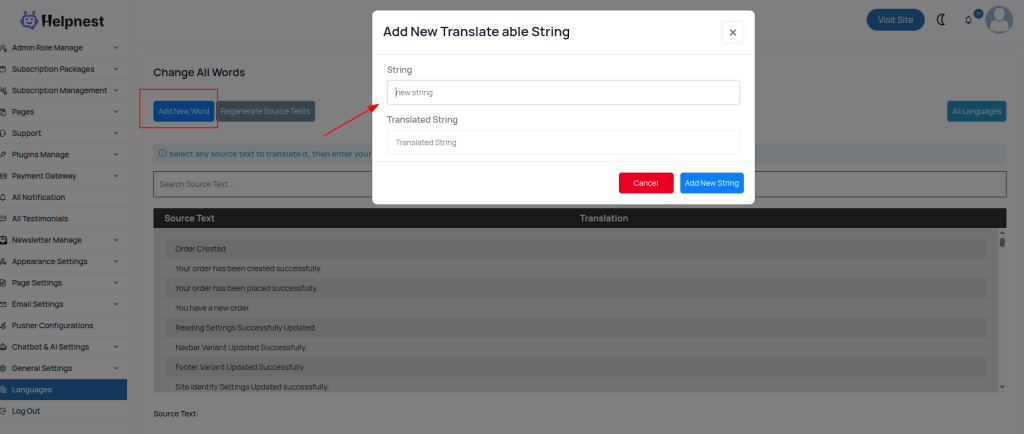 to add new translated string to admin or frontend word, click on add new string button