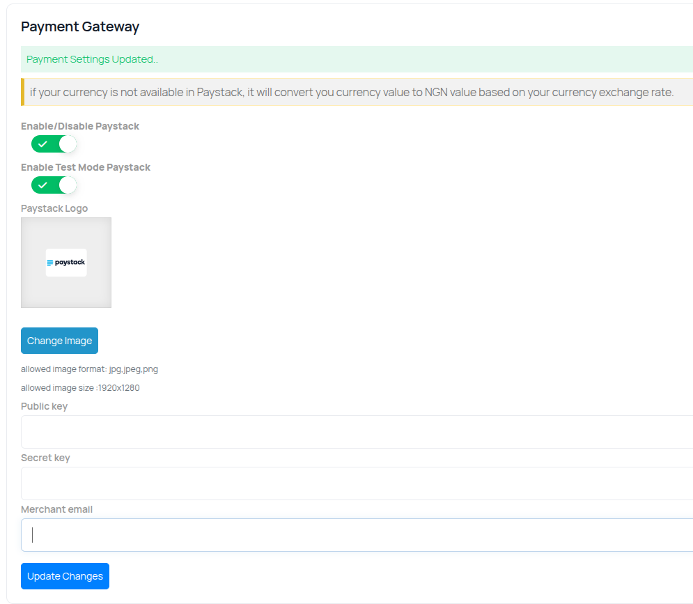 • PayStack Merchant Email: enter your Paystack merchant email, this is mandatory to use Paystack in this cms