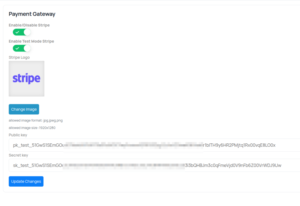 - Enable/Disable Stripe : you can enable/disable stripe payment gateway in the cms.