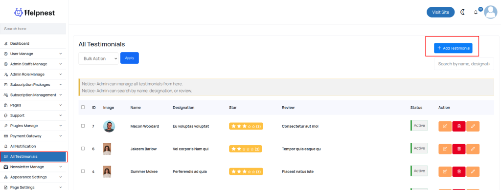 From this page, the admin can view and manage all user reviews and testimonials. You can also add a new review anytime using the “Add Testimonial” button located at the top-right corner of the page.