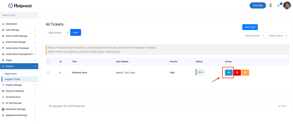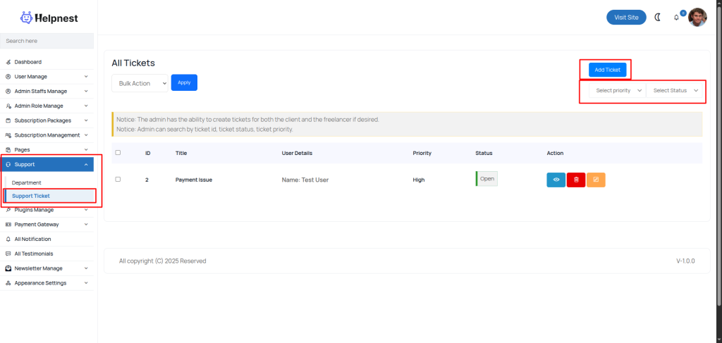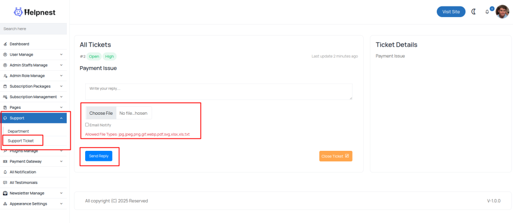 All Tickets To manage Support, go to “Support Tickets > All tickets.” You can close a ticket and delete it. Open and reply to the to the Support Ticket. Doc navigation← Add New Ticket Was this article helpful to you? No Yes How can we help? Name Email Subject Message