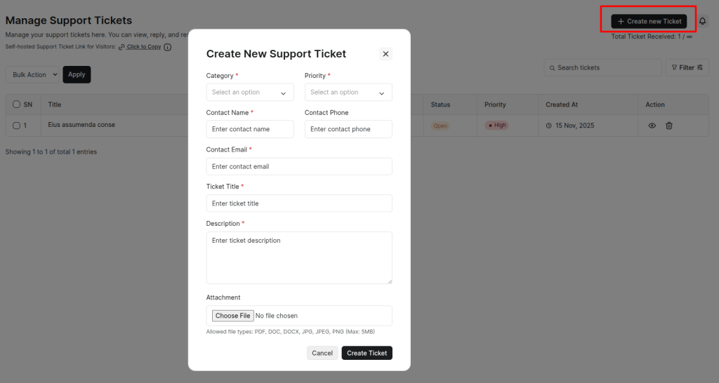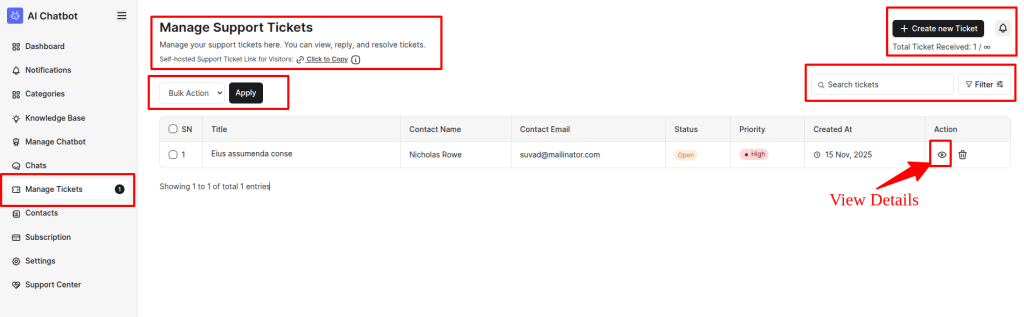 From this page, you can manage all tickets submitted by your users or visitors. The page displays a list of all tickets, along with options for bulk actions, filters, and a Create Ticket button that opens a modal for creating new tickets. You will also find a shareable link that can be sent to users or visitors, allowing them to submit tickets themselves.