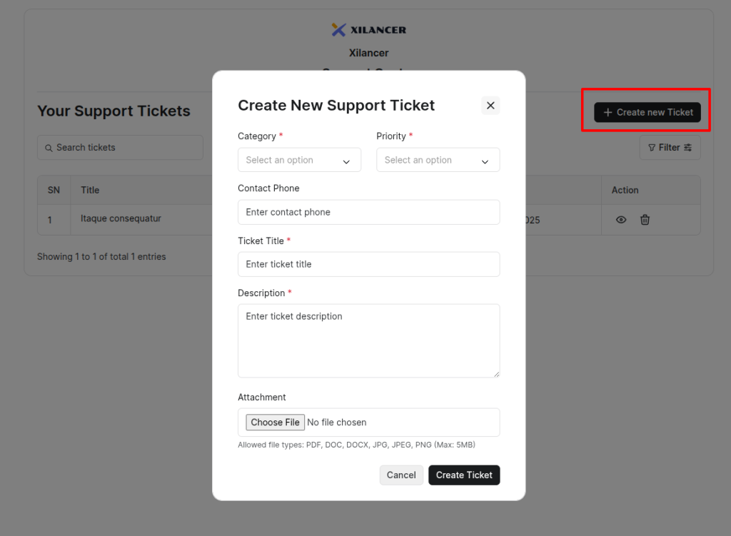 Visitors can use this modal to submit new tickets. They need to provide the required information such as category, priority, title, email, and description.
