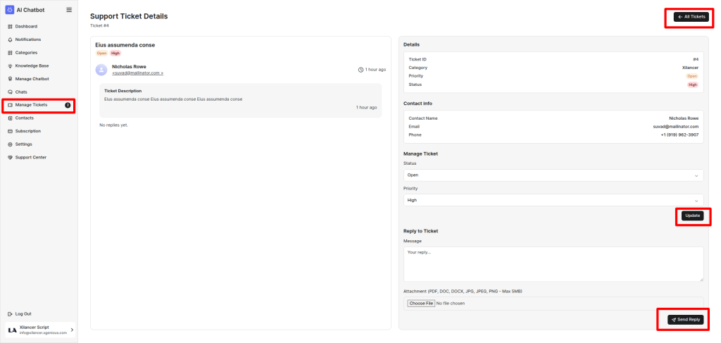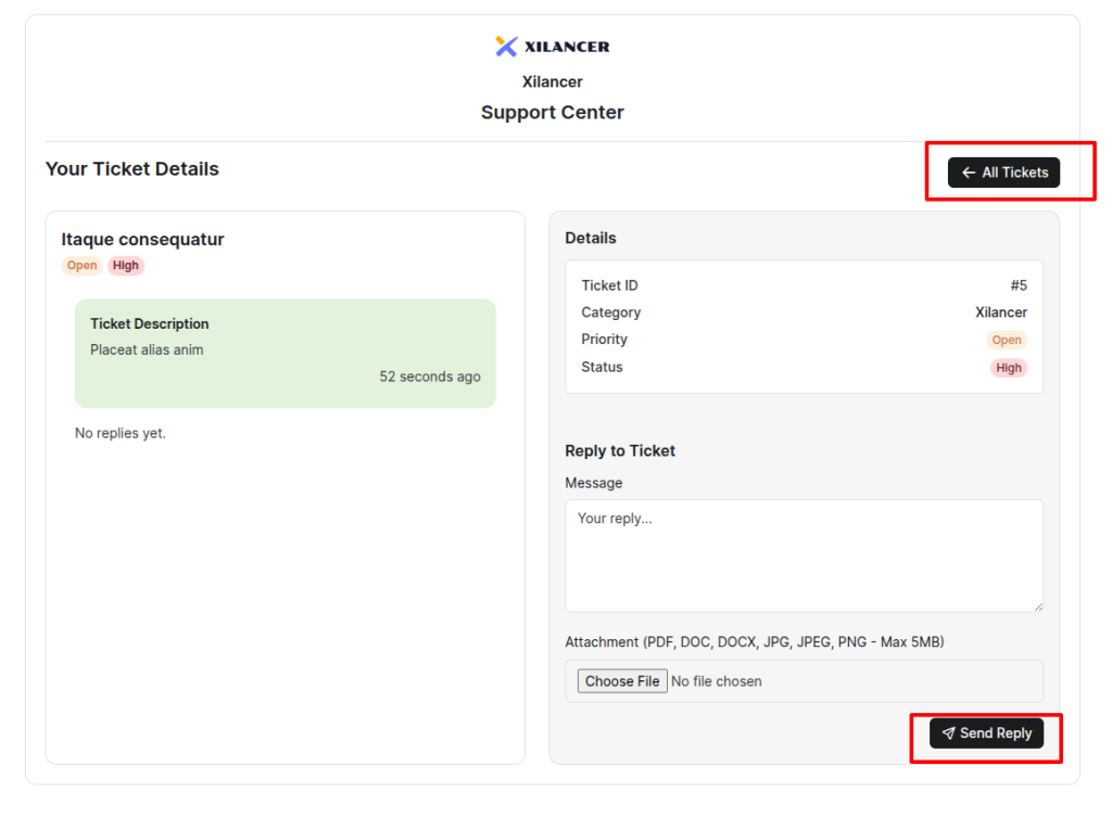 Visitors can view ticket details, reply to tickets, and track responses. This page ensures they stay updated on the progress of their requests.