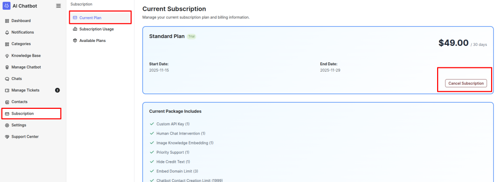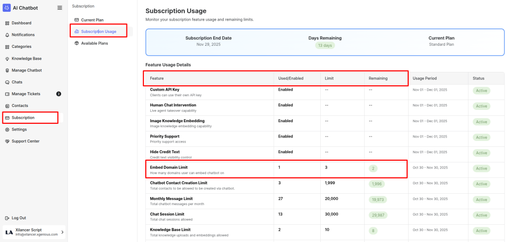 Check your current subscription usage, including any limits, quotas, or activities associated with your plan.