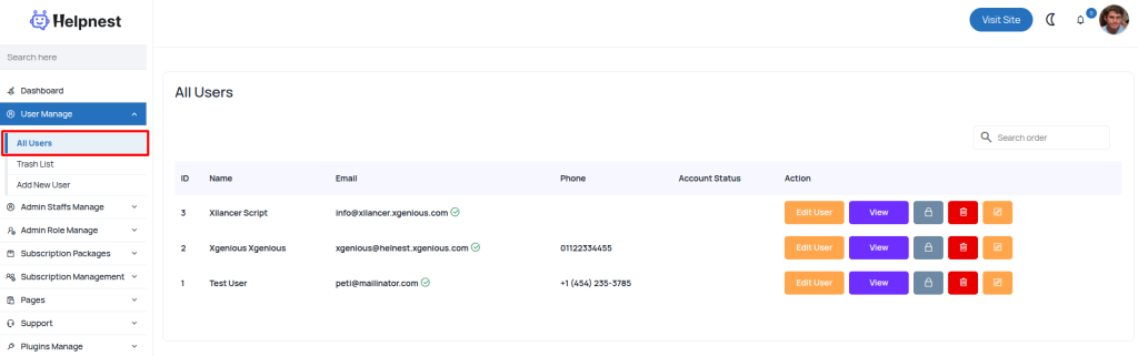 All Users You can easily manage all users from the admin panel under “User Manage -> All Users” admins can view user info, verify email, change password and delete. Was this article helpful to you? No Yes How can we help? Name Email Subject Message
