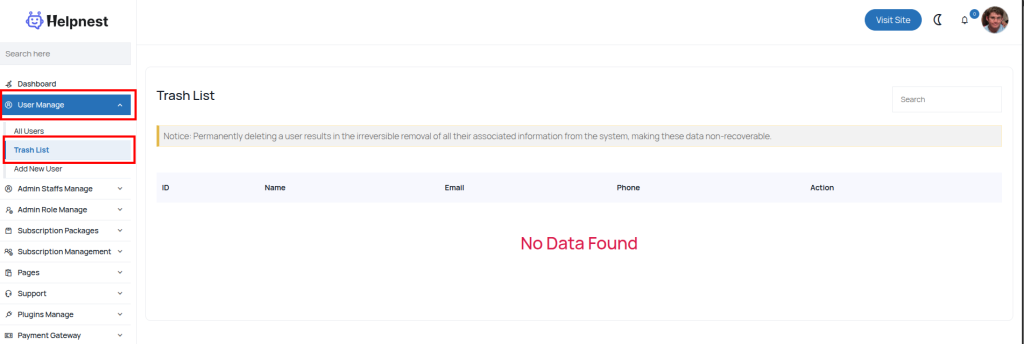 Trash List You can easily manage Trash List from the admin panel under “User Manage -> Trash List” Was this article helpful to you? No Yes How can we help? Name Email Subject Message