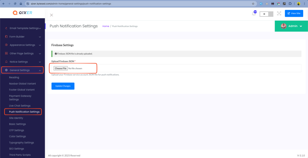 20. Go to your website admin panel-> General Settings -> Push Notification Settings. Upload the json file you got and click Update